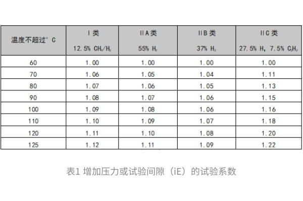 除螺纹接合面外,对于有火焰通路的电气设备,当规定使用的环境温度高于60℃时,应在不低于规定的最高环境温度下进行,但是由于试验条件有限,可以在正常环境温度下,使用规定的试验混合物在按表1的系数增加的压力下进行,或者在正常大气压和温度下,但试验间隙按表1规定的系数增大。